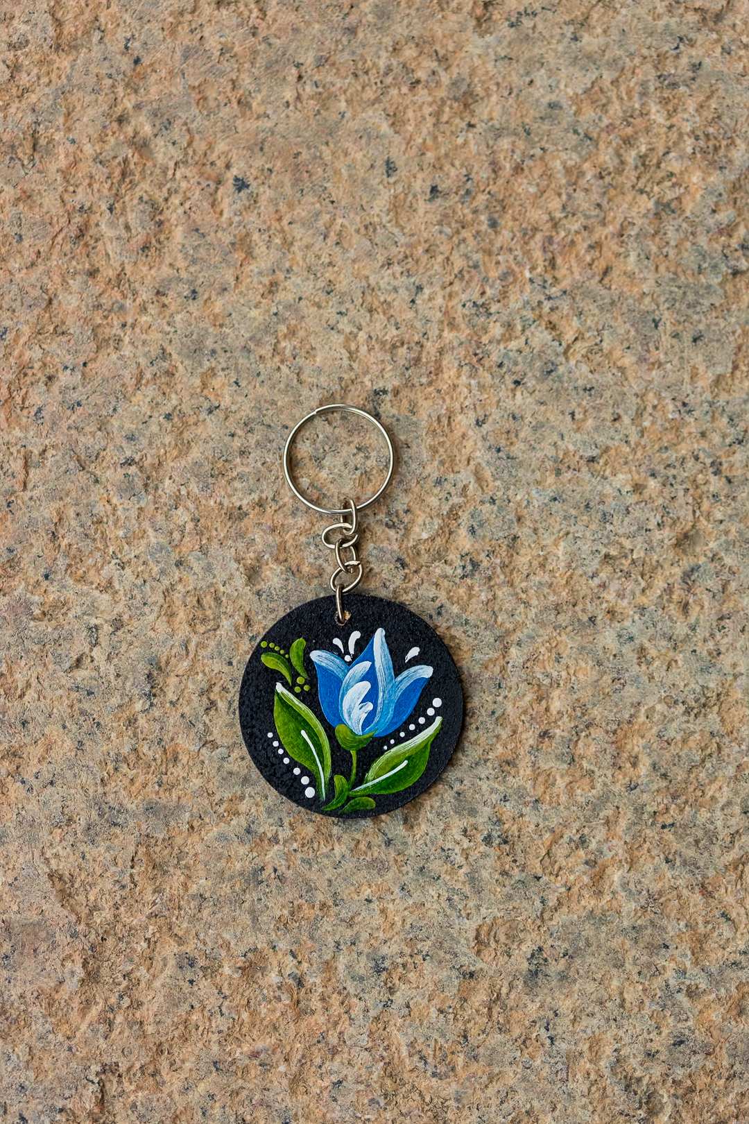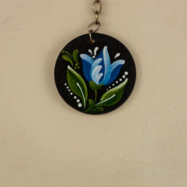 Descrição: Chaveiro produzido em MDF, com dimensões aproximadas de 16 cm X 5 cm, pintado com tinta acrílica utilizando a técnica de BAUERNMALEREI. Essa técnica surgiu na Europa, do séc XVII e trazida para o Brasil principalmente por famílias de imigrantes alemães, estando presente na decoração e memória das casas mais antigas.